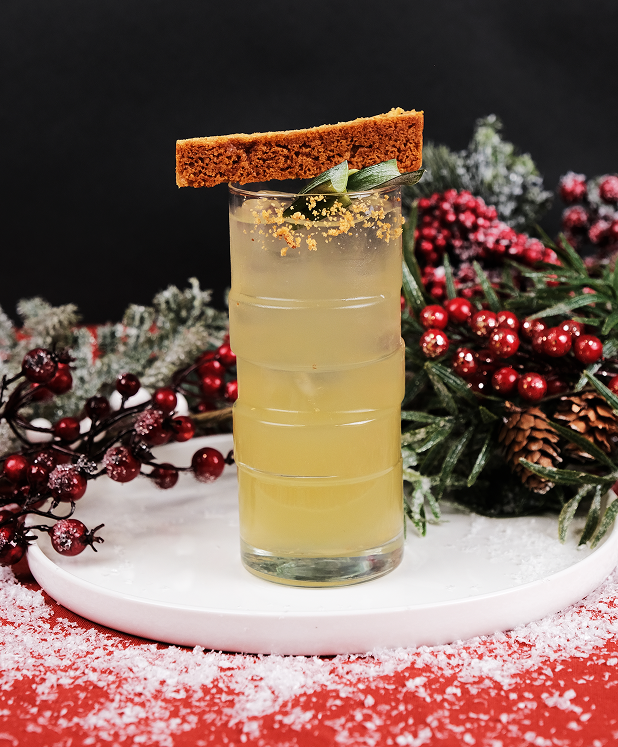 La magie de Noël dans un verre ! Jus de pomme, infusion de feuille de Pandan, jus de citron vert et sirop maison de pain d’épices créent un cocktail parfumé et gourmand.